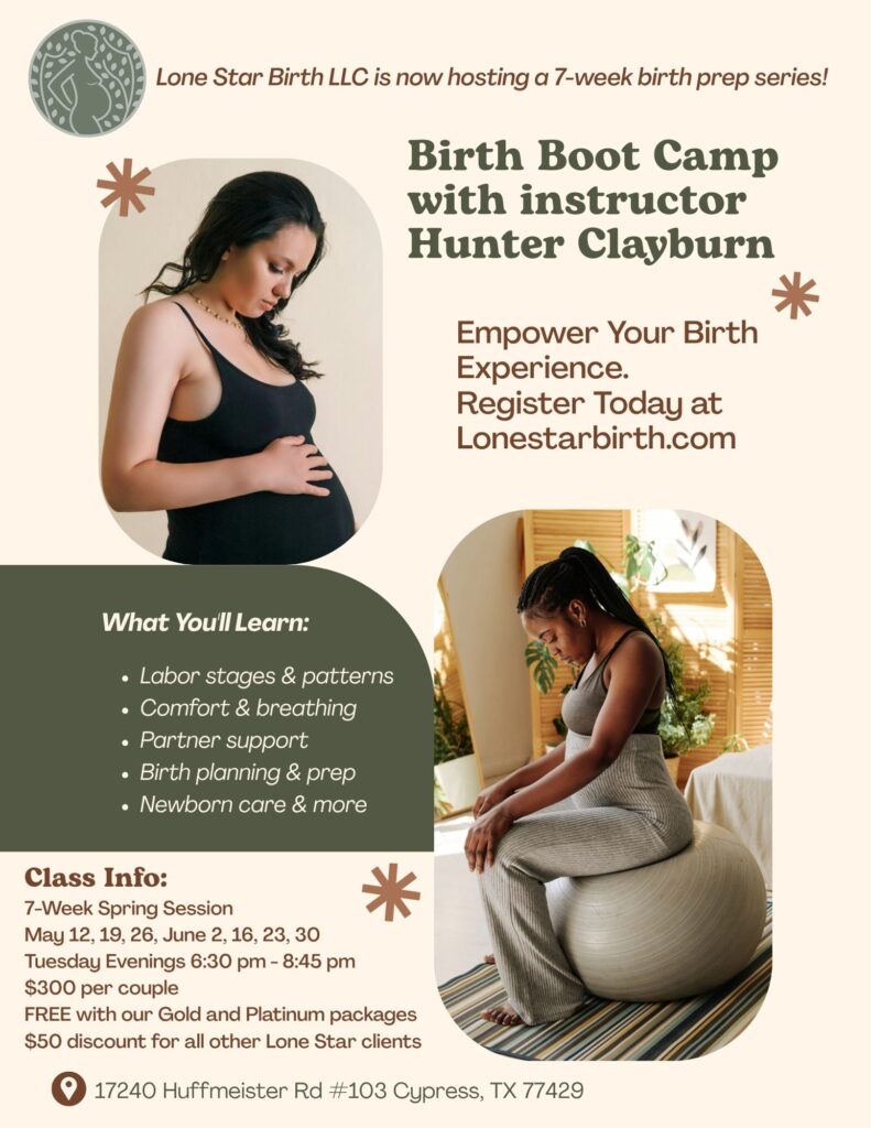 Class Fee: $300. This class series is FREE for those who purchase our Gold or Platinum birth doula packages and there is a $50 discount for all other Lone Star Birth clients.